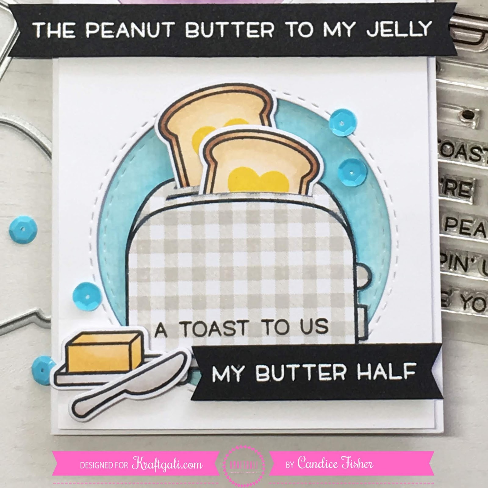 To finish the card, I trimmed some thick black cardstock to fit the sentiments, stamped with versamark ink and heat embossed in white embossing powder, trimmed the edges and pop dotted below the circles. I then stamped the butter and knife, colored with copics, die cut with coordinating dies and pop dotted next to the banner. For the final touch, I added sequins in blue, purple, and green.
